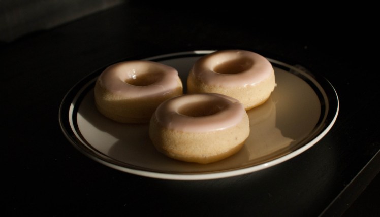 These were another attempt at these vanilla doughnuts from Sprinklebakes. I added just over 1/8 tsp. of nutmeg, used vanilla almond milk with 1 tsp. of apple cider vinegar instead of buttermilk, and only used vanilla (since I didn’t have any beans handy). I’d go a little lighter on the nutmeg next time, but they still turned out quite well!